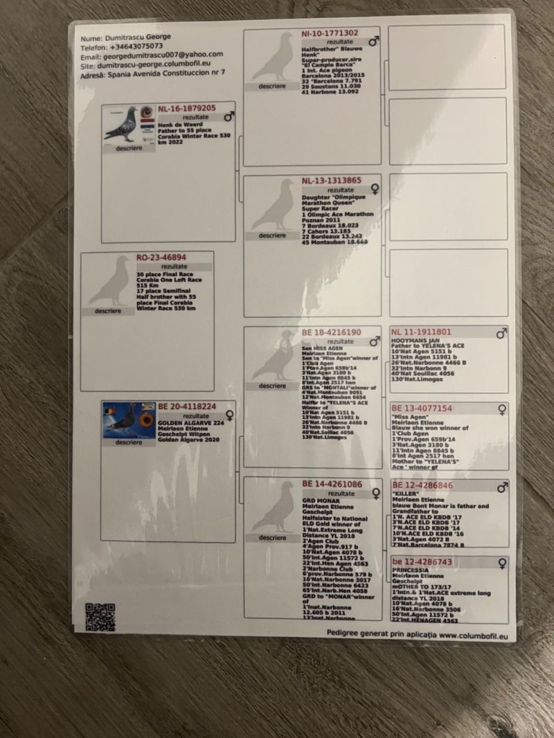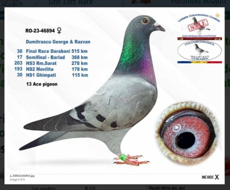 Prezentowany gołąbek to samczyk bardzo dobrej budowy i pochodzeniu . Jest to 13 As Derby Corabia 2023r. Po bardzo wymagającym sezonie . Dumitrascu Gregor jest to super gracz na Wspólnych Gołębnikach którego gołębie osiągają bardzo dobre wyniki hodowcy co śledzą WG wiedzą o kim mowa. Ważna informacja do gołębia dodaje ksero rodowodu bez karty ponieważ karta zaginęła na wspólnym gołębniku w Hiszpanii Więcej informacji w rodowodzie lub telefonicznie.Do wylicytowanej kwoty za gołębia należy dodać koszty transportu około 150/200 zł. Lub odbiór osobisty polecam serdecznie