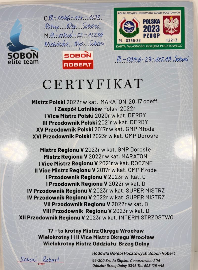 Jest to samczyk o bardzo dobrej budowie wywodzący się z super hodowli Roberta Sobońa który osiąga bardzo dobre wyniki lotowe na skalę Regionu i Polski więcej informacji w rodowodzie lub telefonicznie do wylicytowanej kwoty za gołębia należy dodać koszty transportu około 150/200 zł.