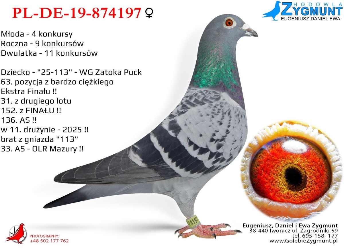 Samica o bardzo dobrym pochodzeniu — linia Pogody × Janssen. Jako roczna 9 konkursów, dwulatka 11 konkursów. Potomstwo bardzo dobrze spisuje się podczas lotów młodych jak i dorosłych. Jej syn „25-113” — 63. pozycja z bardzo ciężkiego Ekstra Finału !! 31. z drugiego lotu !! 152. z FINAŁU !! w 11. drużynie – WG Zatoka Puck. A jego brat z gniazda „25-114” – 33. AS OLR Mazury.