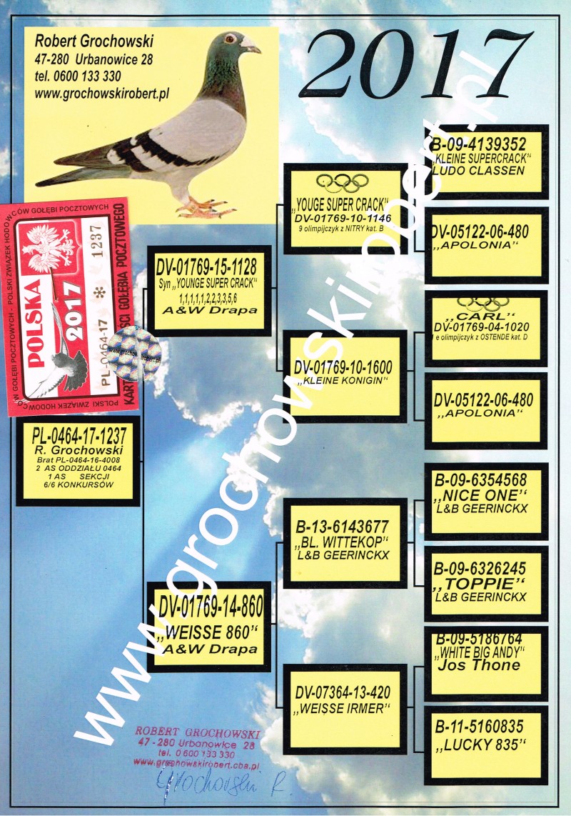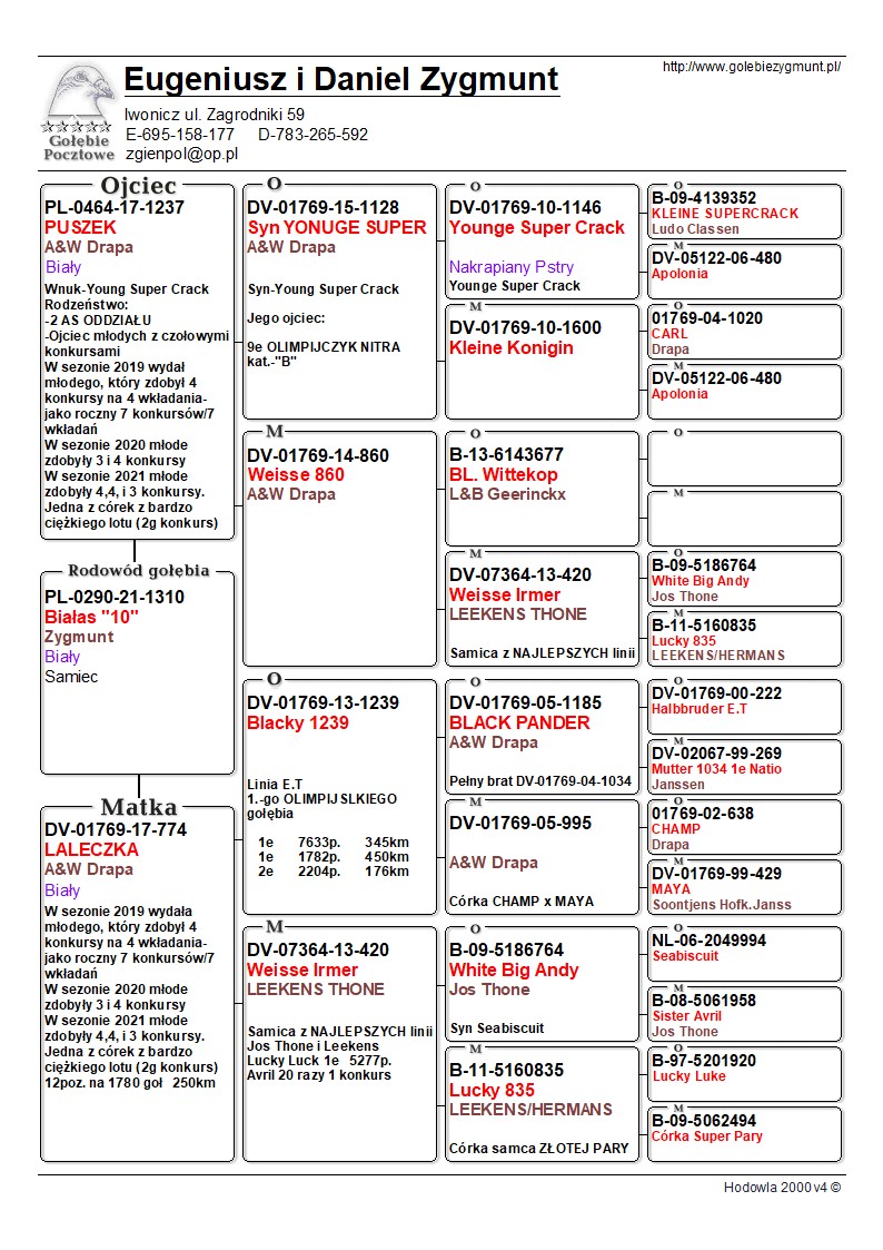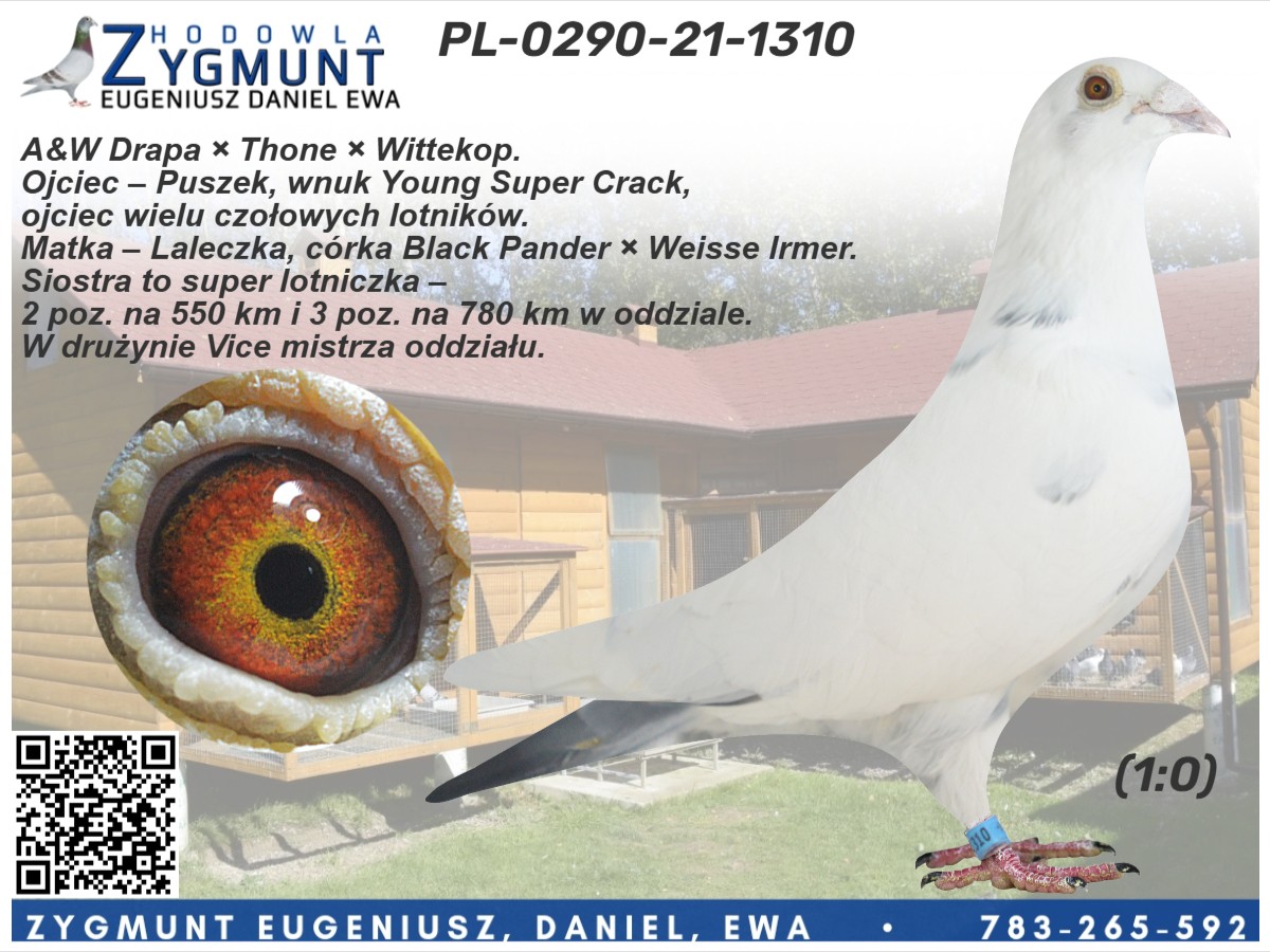 Idealna pod dalsze loty dalekodystansowe i rozpłód. ***Transport: do 2 sztuk – 100 zł, 3–4 sztuki – 150 zł, powyżej 5 sztuk – 200 zł---Sezon 2025 przyniósł kolejne świetne wyniki – zdobyliśmy 4. i 5. miejsce w oddziale oraz tytuł II vice-mistrza oddziału w kategoriach MP oraz kat-A. Na wspólnych gołębnikach nasze ptaki pokazały klasę: 3. miejsce w finale WG Zatoka Puck, 7. AS WG Zatoka Puck, 36. AS OLR SuperCup, 33. i 86. AS OLR Mazury oraz 11. miejsce drużynowo na WG Zatoka Puck. Poprzedni sezon 2024 był jednym z najlepszych w naszej historii – 1., 3. i 4. miejsce w oddziale to wynik, jakiego jeszcze nie było. Do tego 1. i 2. miejsce w kat. MP oraz 1. w kat. A. Sezon zakończyliśmy z 9 gołębiami z 6 konkursami (w tym 5 pierwszych w oddziale) i aż 86 gołębiami z ponad 4 konkursami. Na wspólnych gołębnikach również liczne sukcesy: 2. z finału OLR Mazury, 16. z Ekstra Finału WG Zatoka Puck, 12. z MWG Rogowo, 2. z WG Zatoka Puck, 70. z finału MWG Rogowo, 43. AS Rogowo, 55. z finału OLR SuperCup, 36. AS WG Podhale, a gołąb po naszym samcu zdobył 2. miejsce w finale OLR SuperCup. Więcej informacji w rodowodach lub pod numerem telefonu 783 265 592.
