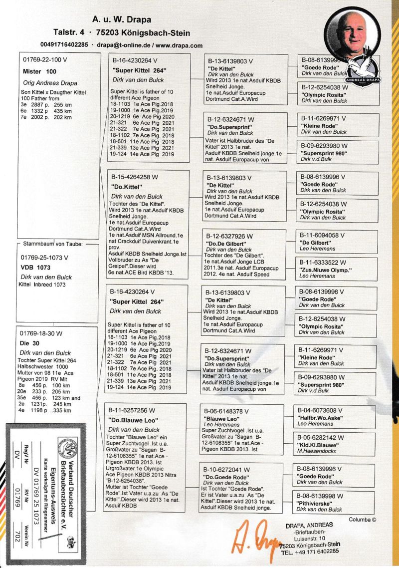**UWAGA podbicie na tej aukcji wynosi 50 zł** Oryginalny gołąb z hodowli Andreasa Drapy. Szczegóły pochodzenia w rodowodzie. Oferowany gołąb to prawodopodobnie SAMIEC. Gołąb znajduje się już w Polsce u kolegi Roberta Grochowskiego. Gołębia można obejrzeć w Urbanowicach woj. opolskie, po wcześniejszym kontakcie telefonicznym. Sprzedający może zorganizować transport gołębia. Koszt przesyłki do najbliższego większego miasta obok miejscowości kupującego to około 70-100zł. Więcej informacji pod numerem 600133330