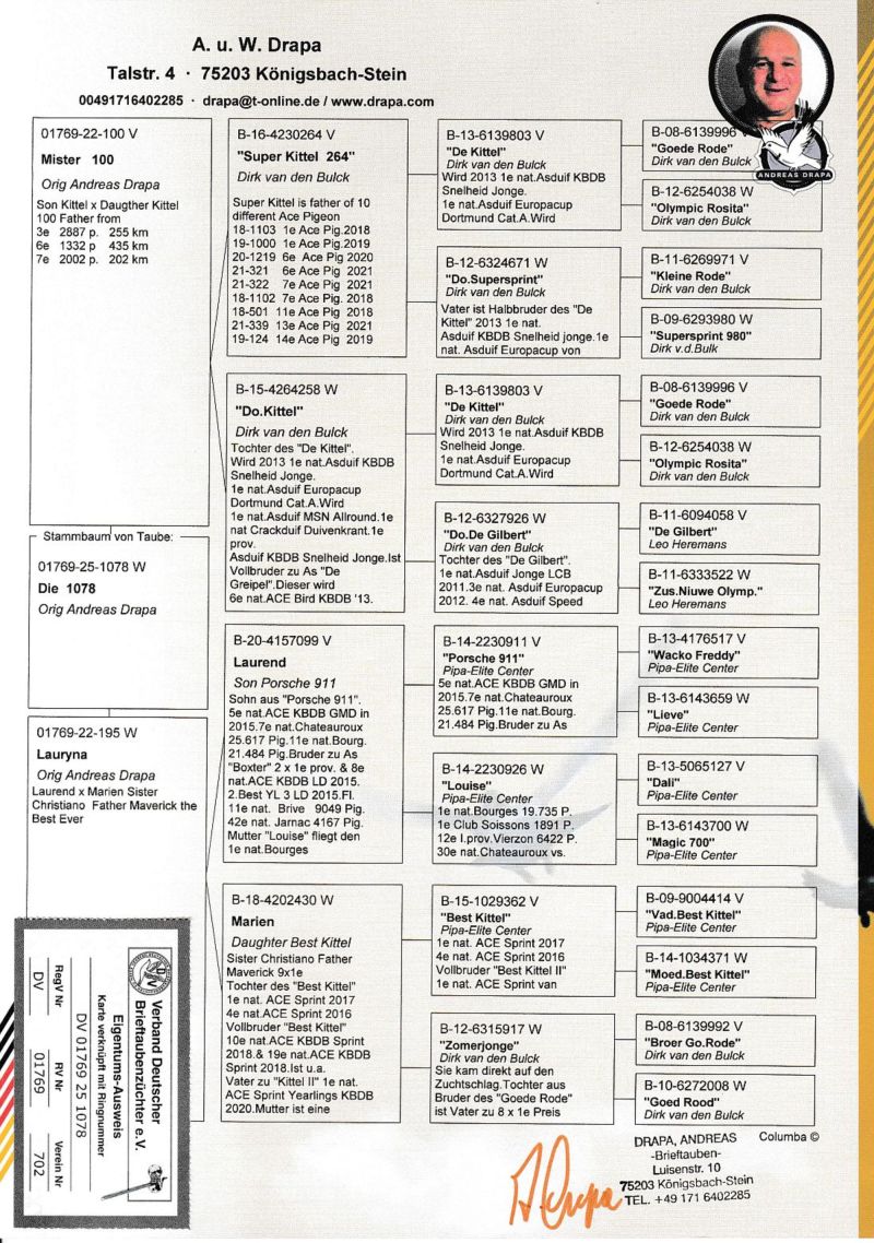**UWAGA podbicie na tej aukcji wynosi 50 zł** Oryginalny gołąb z hodowli Andreasa Drapy. Szczegóły pochodzenia w rodowodzie. Oferowany gołąb to prawodopodobnie SAMICA. Gołąb znajduje się już w Polsce u kolegi Roberta Grochowskiego. Gołębia można obejrzeć w Urbanowicach woj. opolskie, po wcześniejszym kontakcie telefonicznym. Sprzedający może zorganizować transport gołębia. Koszt przesyłki do najbliższego większego miasta obok miejscowości kupującego to około 70-100zł. Więcej informacji pod numerem 600133330