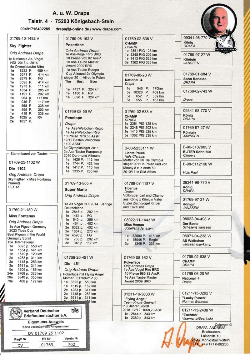 **UWAGA podbicie na tej aukcji wynosi 50 zł** Oryginalny gołąb z hodowli Andreasa Drapy. Szczegóły pochodzenia w rodowodzie. Oferowany gołąb to prawodopodobnie SAMICA. Gołąb znajduje się już w Polsce u kolegi Roberta Grochowskiego. Gołębia można obejrzeć w Urbanowicach woj. opolskie, po wcześniejszym kontakcie telefonicznym. Sprzedający może zorganizować transport gołębia. Koszt przesyłki do najbliższego większego miasta obok miejscowości kupującego to około 70-100zł. Więcej informacji pod numerem 600133330