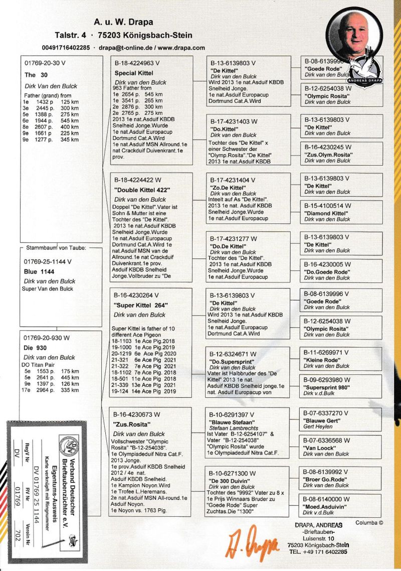 **UWAGA podbicie na tej aukcji wynosi 50 zł** Oryginalny gołąb z hodowli Andreasa Drapy. Szczegóły pochodzenia w rodowodzie. Oferowany gołąb to prawodopodobnie SAMIEC. Gołąb znajduje się już w Polsce u kolegi Roberta Grochowskiego. Gołębia można obejrzeć w Urbanowicach woj. opolskie, po wcześniejszym kontakcie telefonicznym. Sprzedający może zorganizować transport gołębia. Koszt przesyłki do najbliższego większego miasta obok miejscowości kupującego to około 70-100zł. Więcej informacji pod numerem 600133330