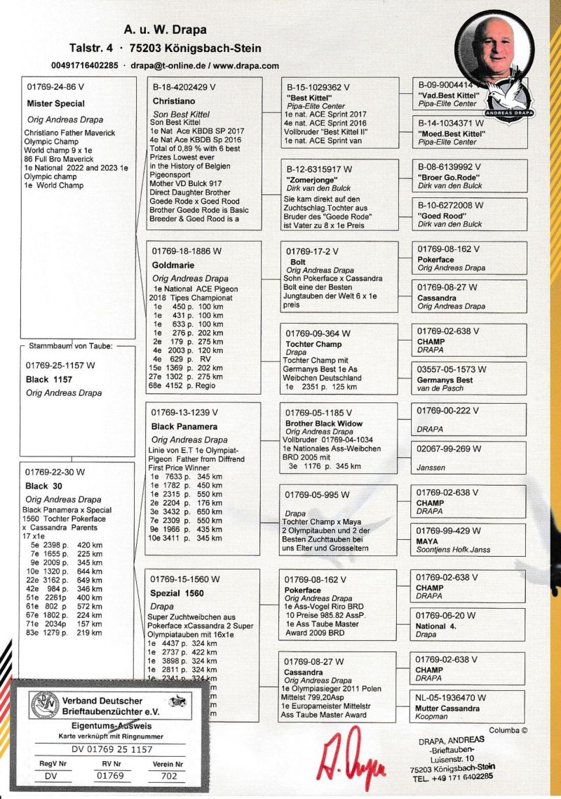 **UWAGA podbicie na tej aukcji wynosi 50 zł** Oryginalny gołąb z hodowli Andreasa Drapy. Szczegóły pochodzenia w rodowodzie. Oferowany gołąb to prawodopodobnie SAMICA. Gołąb znajduje się już w Polsce u kolegi Roberta Grochowskiego. Gołębia można obejrzeć w Urbanowicach woj. opolskie, po wcześniejszym kontakcie telefonicznym. Sprzedający może zorganizować transport gołębia. Koszt przesyłki do najbliższego większego miasta obok miejscowości kupującego to około 70-100zł. Więcej informacji pod numerem 600133330