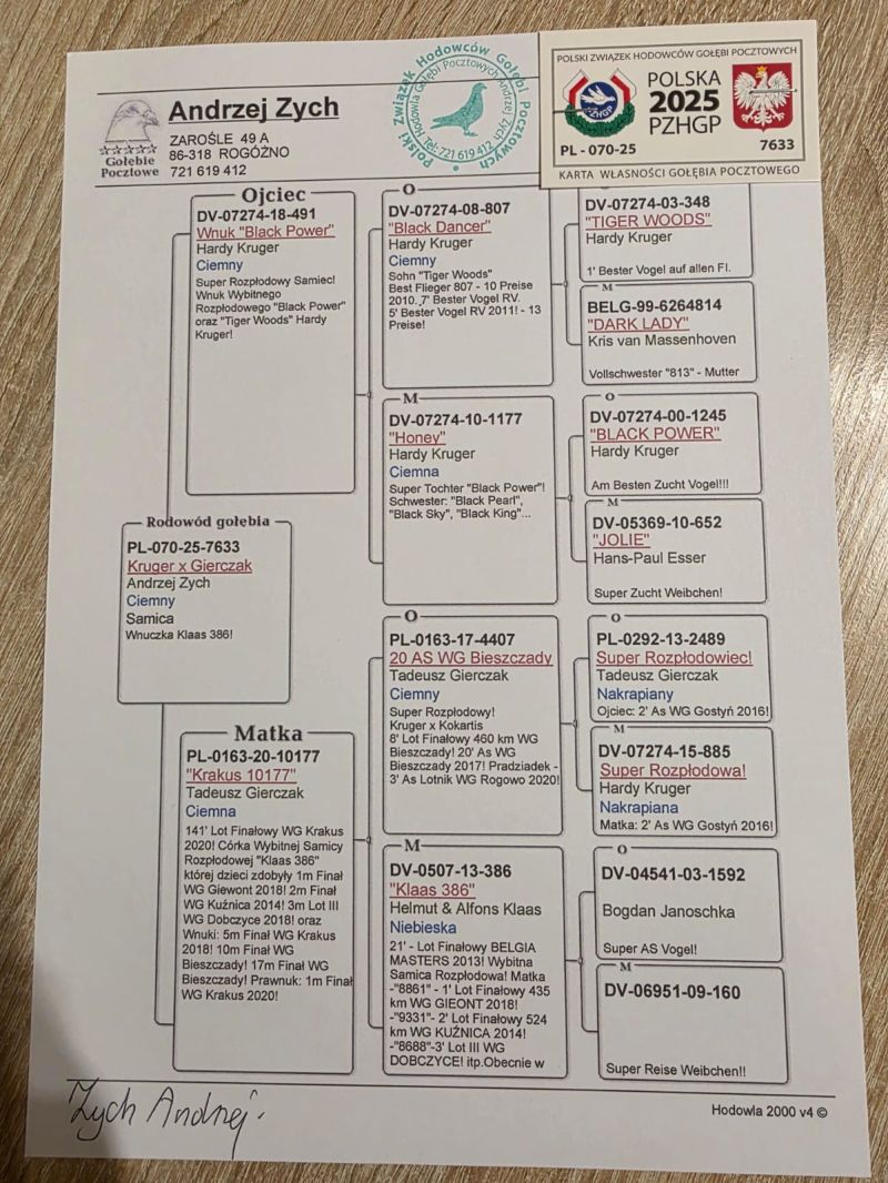 Oryginalny gołąb z hodowli Andrzeja Zycha. Szczegóły pochodzenia zamieszczone w rodowodzie. Więcej informacji pod numerem telefonu: 721 619 412