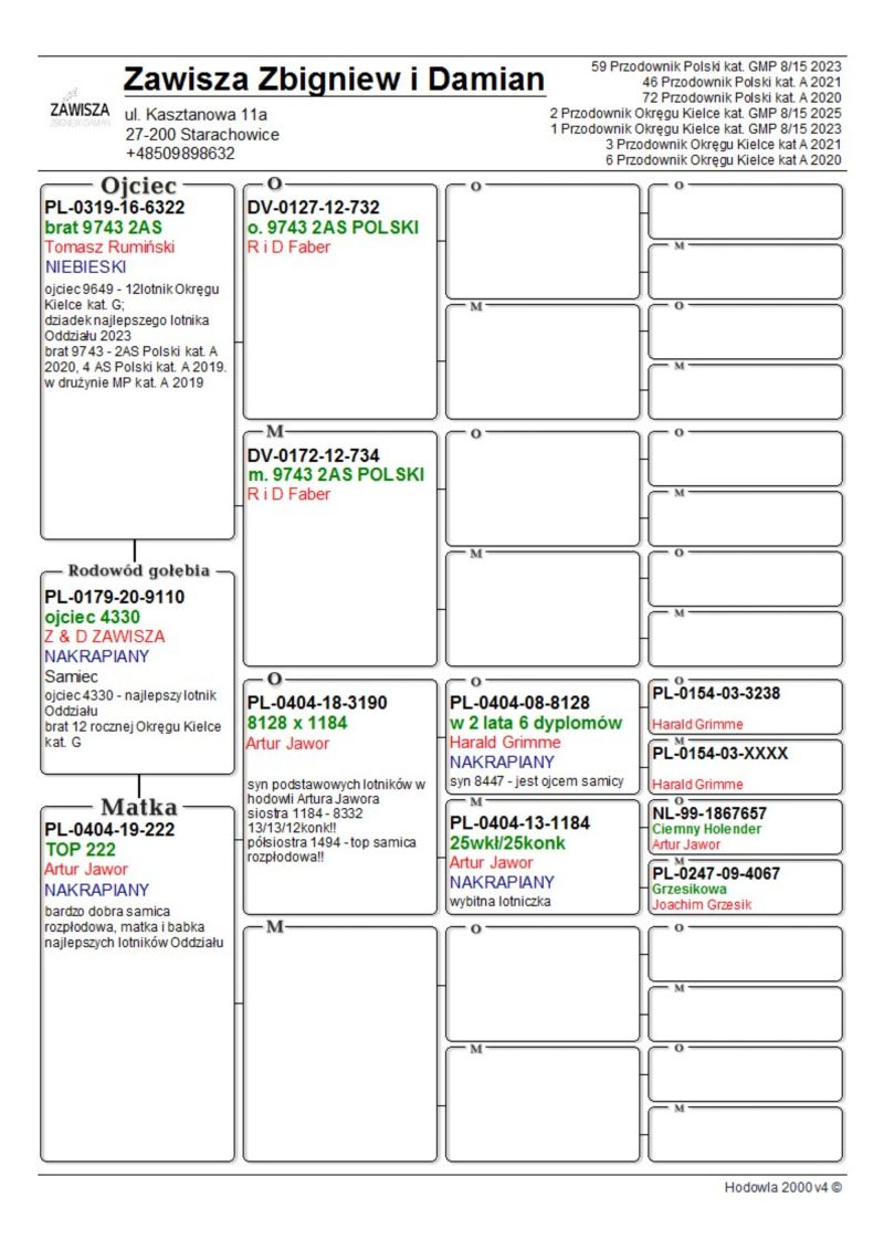 Ojciec najlepszego młodego lotnika oddziału wg punktów i coef. 5wkł/5konk. Jest synem 222 (jedna z podstawowych samic rozpłodowych). Jego ojciec to brat wybitnej lotniczki w kat. A u Tomasza Rumińskiego 2,4AS Polski - 100% Faber. Siostra najlepsza lotniczka Oddziału kat. A i G. Odbiór osobisty lub dostawa po ustaleniu kosztów (w zależności od dostępności kurierów 150-200zł) Więcej szczegółów w rodowodzie lub 509898632