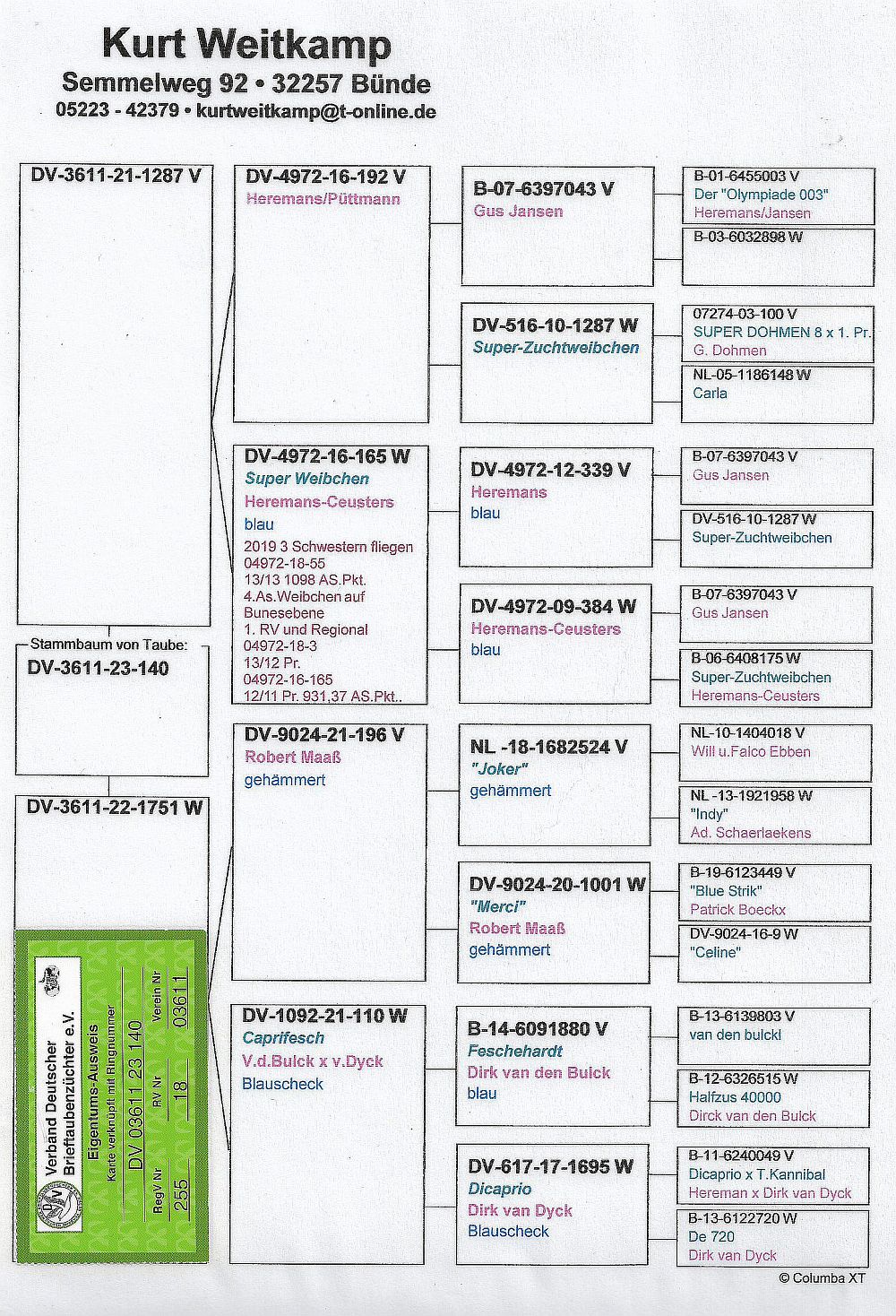 oryg. Kurt Weitkamp (Heremans/ v.d. Bulck) Szczegóły pochodzenia w rodowodzie. Więcej informacji o gołębiu i transporcie pod nr tel.: 606 356 477.