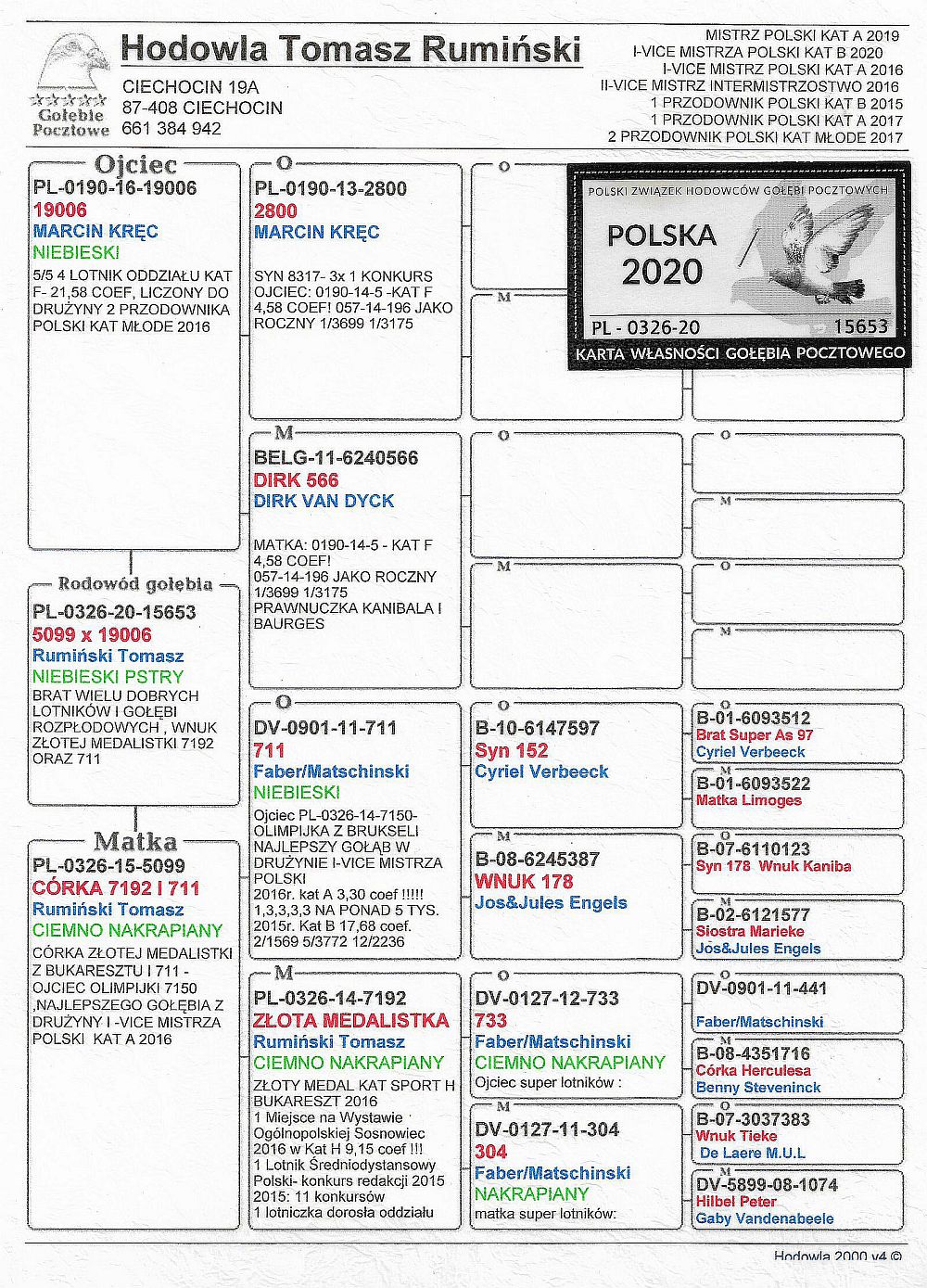 oryg. Tomasz Rumiński (Van Dyck/ Faber), wnuk "7192", "711" Szczegóły pochodzenia w rodowodzie. Więcej informacji o gołębiu i transporcie pod nr tel.: 606 356 477.