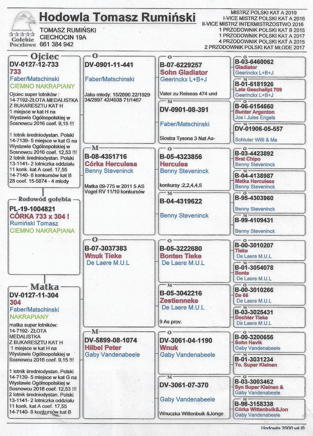 oryg. Tomasz Rumiński (Faber/ De Laere), córka: "733" x "304" Szczegóły pochodzenia w rodowodzie. Więcej informacji o gołębiu i transporcie pod nr tel.: 606 356 477.