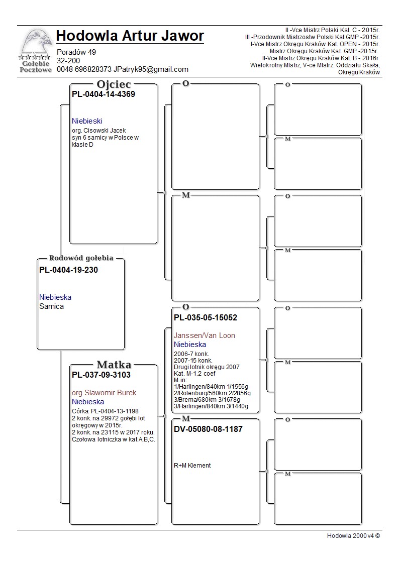 wnuczka 3103 - matka super lotników i gołębi rozpłodowych w hodowli Artura Jawora. Ojciec syn dwóch podstawowych gołębi rozpłodowych - 8447 i 1494 dzieci 8128 i 8136 H.Grimme. Matka to córka 3103 i 4369 (ojciec 4574 super lotnika kat. A/B) Odbiór osobisty lub dostawa po ustaleniu kosztów (w zależności od dostępności kurierów 150-200zł) Więcej szczegółów w rodowodzie lub 509898632