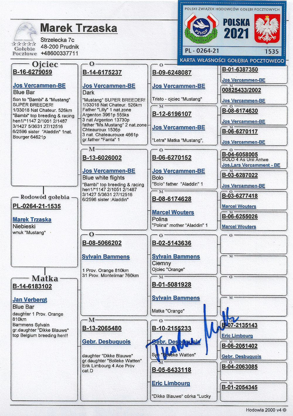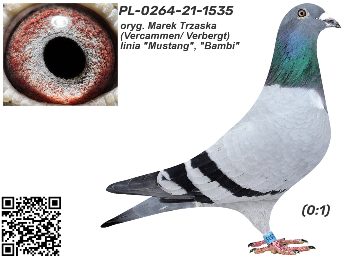 oryg. Marek Trzaska (Vercammen/ Verbergt), linia "Mustang", "Bambi" Szczegóły pochodzenia w rodowodzie. Więcej informacji o gołębiu i transporcie pod nr tel.: 606 419 785 - kol. Jerzy Brucki.