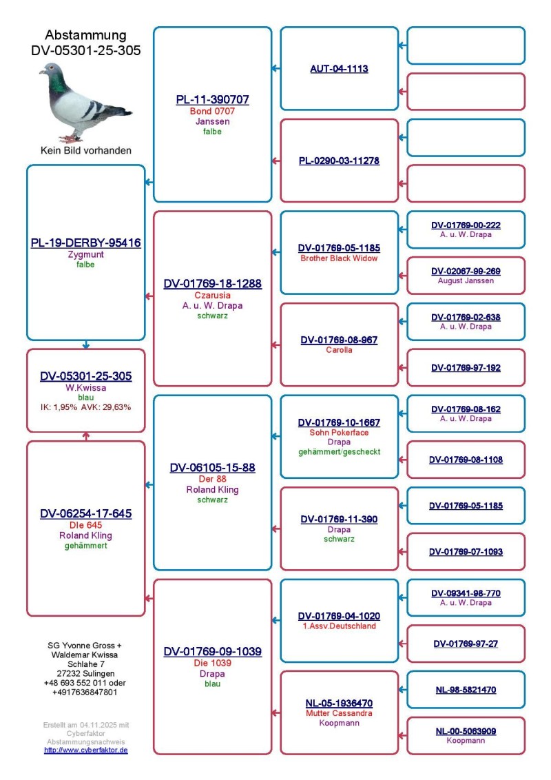 Oryginalny gołąb z hodowli Waldemar Kwissa. Fajne połączenie. Szczegóły pochodzenia w rodowodzie, karty własności będą dołączone do rodowodów. Więcej informacji pod nr tel.: 693552011. Koszt wysyłki od 1 do 4 szt150 zł