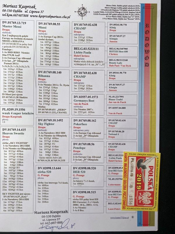 Oryginalny gołąb z hodowli Mariusza Kasprzaka, sprzedawany z gołębnika A.Sękulskiego ze względu na likwidację hodowli. Szczegóły pochodzenia w rodowodzie. Więcej informacji pod nr tel.: 501 651 478