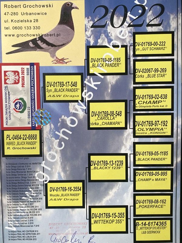 Oryginalny gołąb z hodowli Roberta Grochowskiego, sprzedawany z gołębnika A.Sękulskiego ze względu na likwidację hodowli. Szczegóły pochodzenia w rodowodzie. Więcej informacji pod nr tel.: 501 651 478