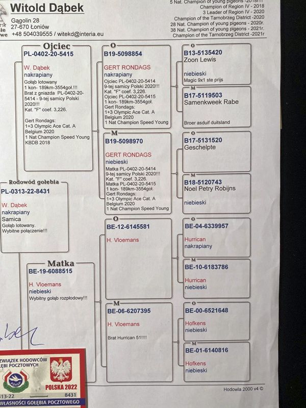 Oryginalny gołąb z hodowli Witolda Dąbka, sprzedawany z gołębnika A.Sękulskiego ze względu na likwidację hodowli. Szczegóły pochodzenia w rodowodzie. Więcej informacji pod nr tel.: 501 651 478
