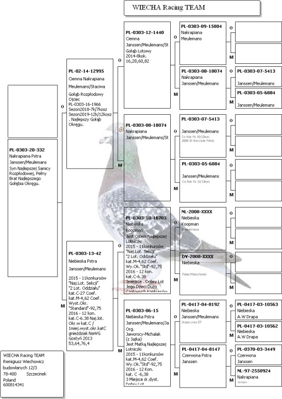 Oryginalny gołąb z hodowli R.Wiechowicza. Syn najlepszego gołębia na gołębniku. Jego matka dobyła 23 konkursy na 24 wkładania. W sezonie 2015 była 2 asem kat.M w okręgu, w sezonie 2016 1 asem kat.C w okręgu. Zdobyła I miejsce na wystawie okręgowej w kat.C i był to 28 wynik na wystawie ogólnopolskiej. Jest również pełnym bratem samicy PL-0303-16-1966, która w sezonie 2019 została najlepszym gołębiem okręgu w open. Szczegóły pochodzenia w rodowodzie. Więcej informacji pod nr tel.: 600 814 341
