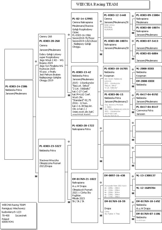 Oryginalny gołąb z hodowli R.Wiechowicza. Wnuk najlepszego gołębia na gołębniku. Jego babcia dobyła 23 konkursy na 24 wkładania. W sezonie 2015 była 2 asem kat.M w okręgu, w sezonie 2016 1 asem kat.C w okręgu. Zdobyła I miejsce na wystawie okręgowej w kat.C i był to 28 wynik na wystawie ogólnopolskiej. Jego ojciec jest pełnym bratem samicy PL-0303-16-1966, która w sezonie 2019 została najlepszym gołębiem okręgu w open. Szczegóły pochodzenia w rodowodzie. Więcej informacji pod nr tel.: 600 814 341