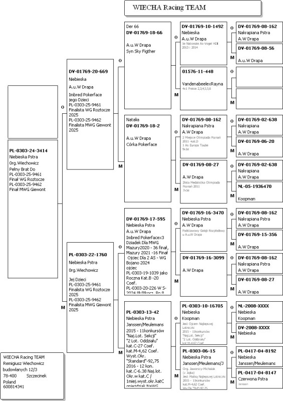 Oryginalny gołąb z hodowli R.Wiechowicza. Syn 669 oryg. A.Drapa inbred Pokerface x 1760 córka 595 oryg. A.Drapa, wnuk Cassandra, podwójny wnuk/inbred Pokerface x PL0303-13-42 najlepszy gołąb okręgu, 28 gołąb w Polsce w kat.C Sport 2016. Samiec jest wnukiem najlepszego gołębia na gołębniku. Jego babcia zdobyła 23k/24 wkł. W sezonie 015 była 2 asem kat.M w okęgu, w sezonie 2016 byla 1 asem kat.C w okręgu. Zdobyła I miejsce na wystawie okręgowej w kat.C i był to 28 wynik na wystawie ogólnopolskiej. Szczegóły pochodzenia w rodowodzie. Więcej informacji pod nr tel.: 600 814 341