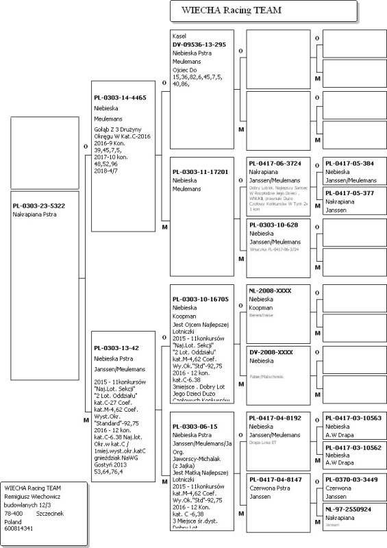 Oryginalny gołąb z hodowli R.Wiechowicza. Córka najlepszego gołębia na gołębniku. Jej matka dobyła 23 konkursy na 24 wkładania. W sezonie 2015 była 2 asem kat.M w okręgu, w sezonie 2016 1 asem kat.C w okręgu. Zdobyła I miejsce na wystawie okręgowej w kat.C i był to 28 wynik na wystawie ogólnopolskiej. Ojcem jest mój najlepszy samiec lotowy. Szczegóły pochodzenia w rodowodzie. Więcej informacji pod nr tel.: 600 814 341