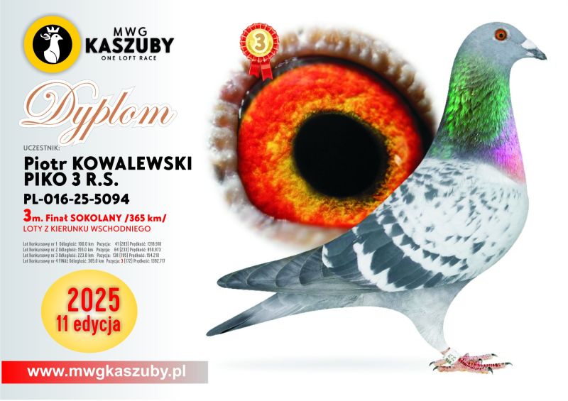 Gołąb (3 MIEJSCE z lotu Finałowego, 3 AS) brał udział w zawodach na Wspólnym Gołębniku KASZUBY. Więcej informacji w rodowodzie i załącznikach. Kontakt do Właściciela Gołębnika tel.601686344 (Sebastian Ostoja-Lniski). Informujemy poza tym, że rozpoczęły się zapisy na sezon 2026. Serdecznie zapraszam do rywalizacji.