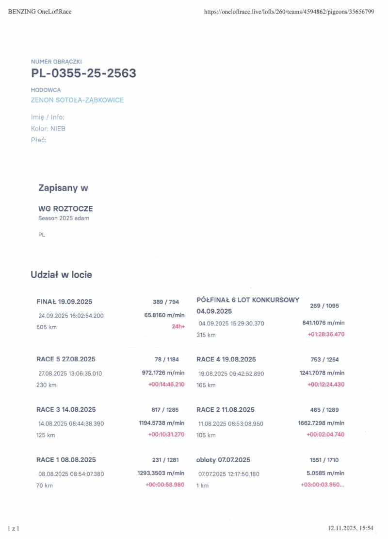 Opis: Gołąbek po całym bardzo wymagającym programie na WG ROZTOCZE 2025 loty z wiatrem pod wiatr i boczny w każdych warunkach sobie poradziły. 7 Lotów Konkursowych 1515 kkm zdobywając 389 miejsce z Finału 505km . więcej info.w rodowodzie i na stronie Benzing Live. oneloftrace.live/lofts/260?season=2458&tab=flights zapraszamy na sezon 2026. Dostawa wylicytowanego gołębia na terenie Polski 160zł.