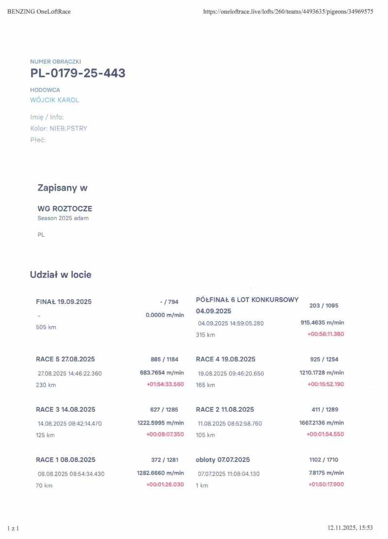 Opis: Gołąbek po całym bardzo wymagającym programie na WG ROZTOCZE 2025 loty z wiatrem pod wiatr i boczny w każdych warunkach sobie poradziły. 7 Lotów Konkursowych 1515 kkm zdobywając miejsce z Finału 505km. więcej info.w rodowodzie i na stronie Benzing Live. oneloftrace.live/lofts/260?season=2458&tab=flights zapraszamy na sezon 2026. Dostawa wylicytowanego gołębia na terenie Polski 160zł.