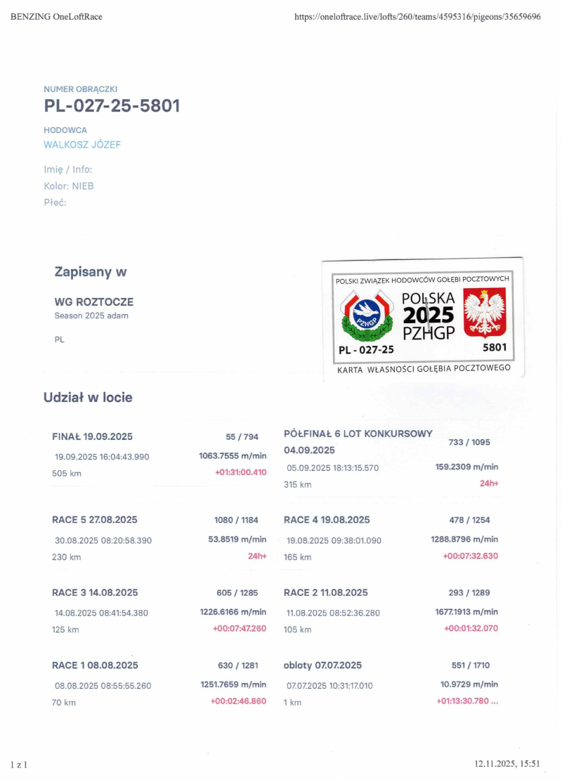 Opis: Opis: Gołąbek po całym bardzo wymagającym programie na WG ROZTOCZE 2025 loty z wiatrem pod wiatr i boczny w każdych warunkach sobie poradziły. 7 Lotów Konkursowych 1515 kkm zdobywając 55 miejsce z Finału 505km. więcej info.w rodowodzie i na stronie Benzing Live. oneloftrace.live/lofts/260?season=2458&tab=flights zapraszamy na sezon 2026. Dostawa wylicytowanego gołębia na terenie Polski 160zł.