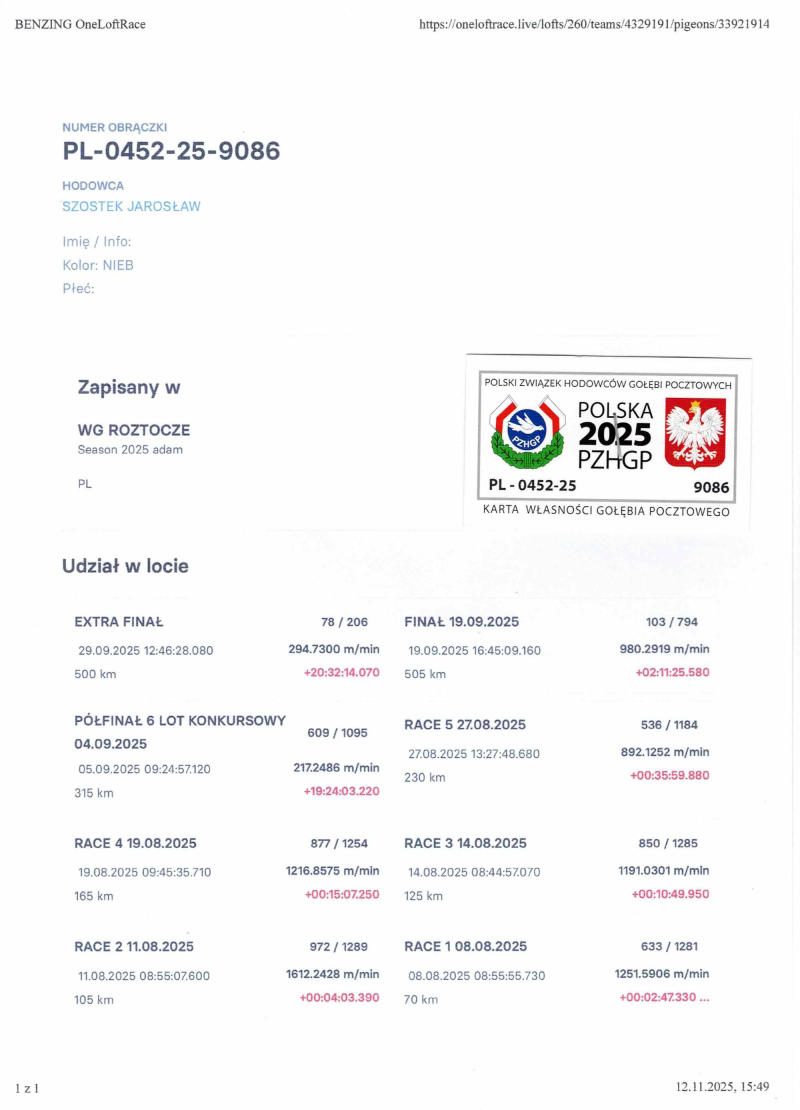 PL-0452-25-9086 WG ROZTOCZE FINAŁ 103poz.505km Extra Finał 78poz.500km 2x500km