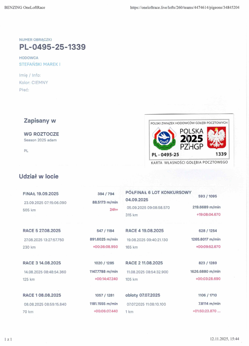 Płeć: samiec Hodowca - rasa: Oryg.STEFAŃSKI MAREK Zakończenie: 22.11.2025 godz. 18:08