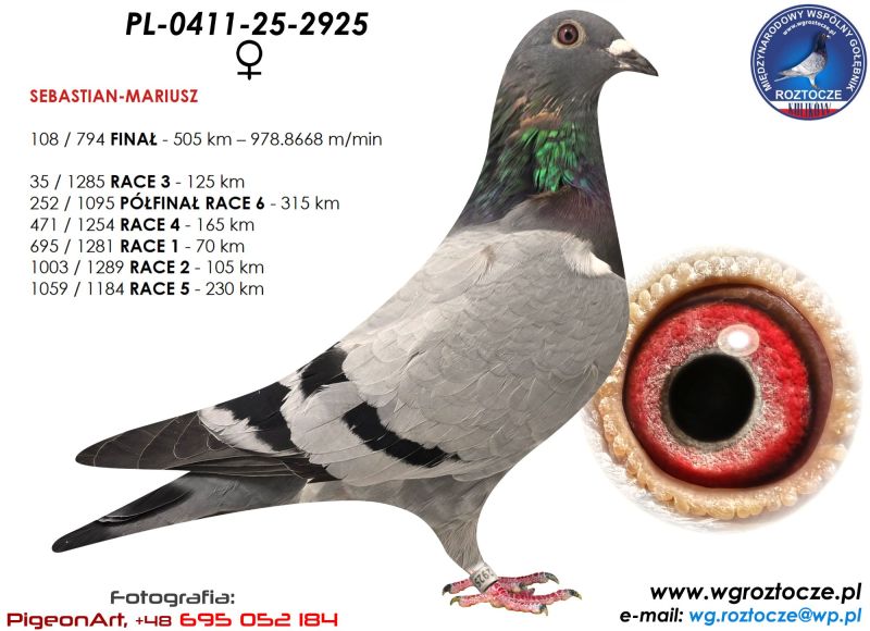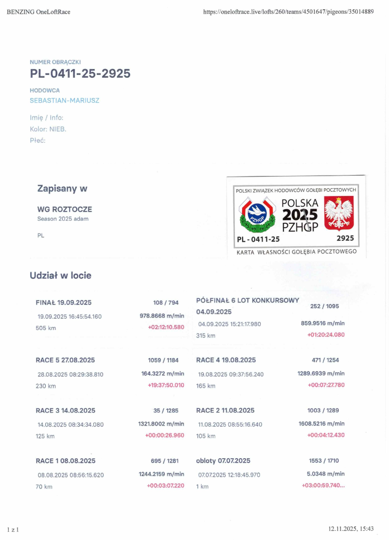 Gołąbek po całym bardzo wymagającym programie na WG ROZTOCZE 2025 loty z wiatrem pod wiatr i boczny w każdych warunkach sobie poradziły. 7 Lotów Konkursowych 1515 kkm zdobywając 108 miejsce z Finału 505km. więcej info.w rodowodzie i na stronie Benzing Live. oneloftrace.live/lofts/260?season=2458&tab=flights zapraszamy na sezon 2026. Dostawa wylicytowanego gołębia na terenie Polski 160zł.