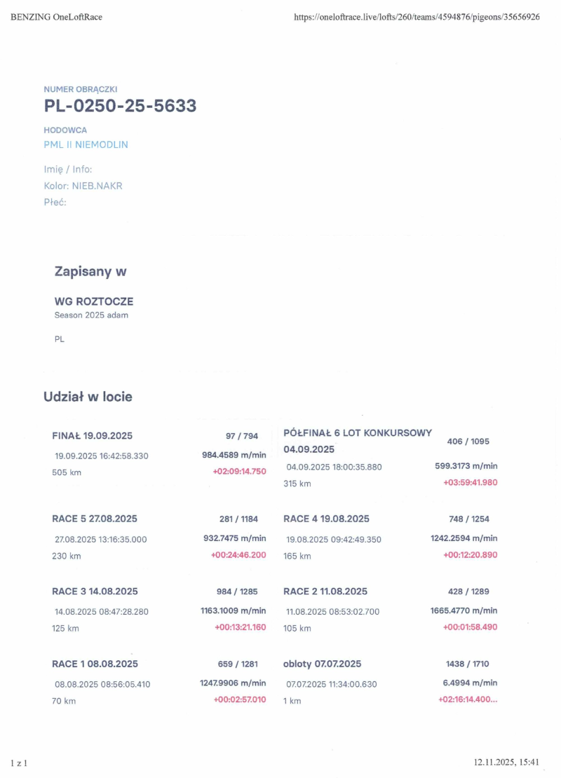 Gołąbek po całym bardzo wymagającym programie na WG ROZTOCZE 2025 loty z wiatrem pod wiatr i boczny w każdych warunkach sobie poradziły. 7 Lotów Konkursowych 1515 kkm zdobywając 97 miejsce z Finału 505km. więcej info.w rodowodzie i na stronie Benzing Live. oneloftrace.live/lofts/260?season=2458&tab=flights zapraszamy na sezon 2026. Dostawa wylicytowanego gołębia na terenie Polski 160zł.