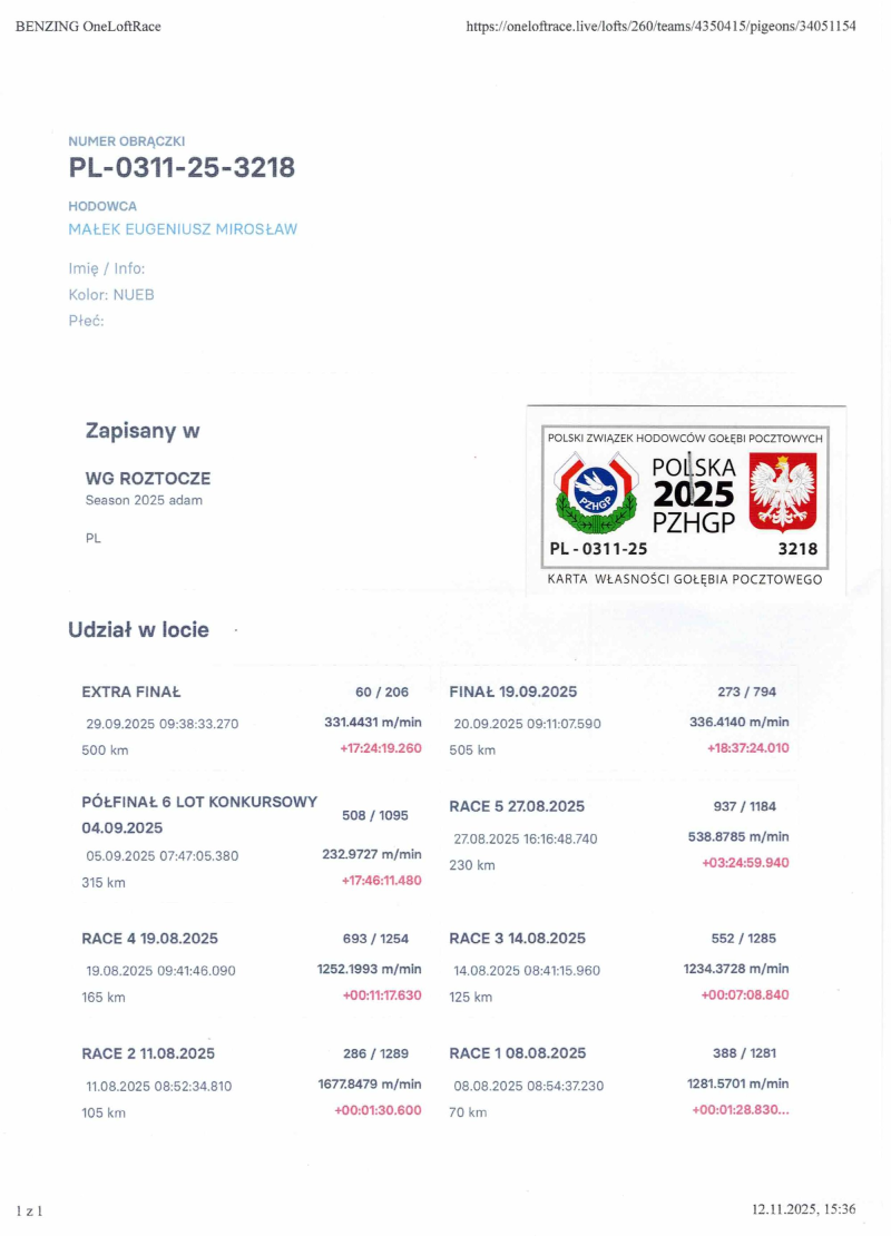 PL-0311-25-3218 WG ROZTOCZE FINAŁ 273poz.505km Extra Finał 60poz.500km 2x500km