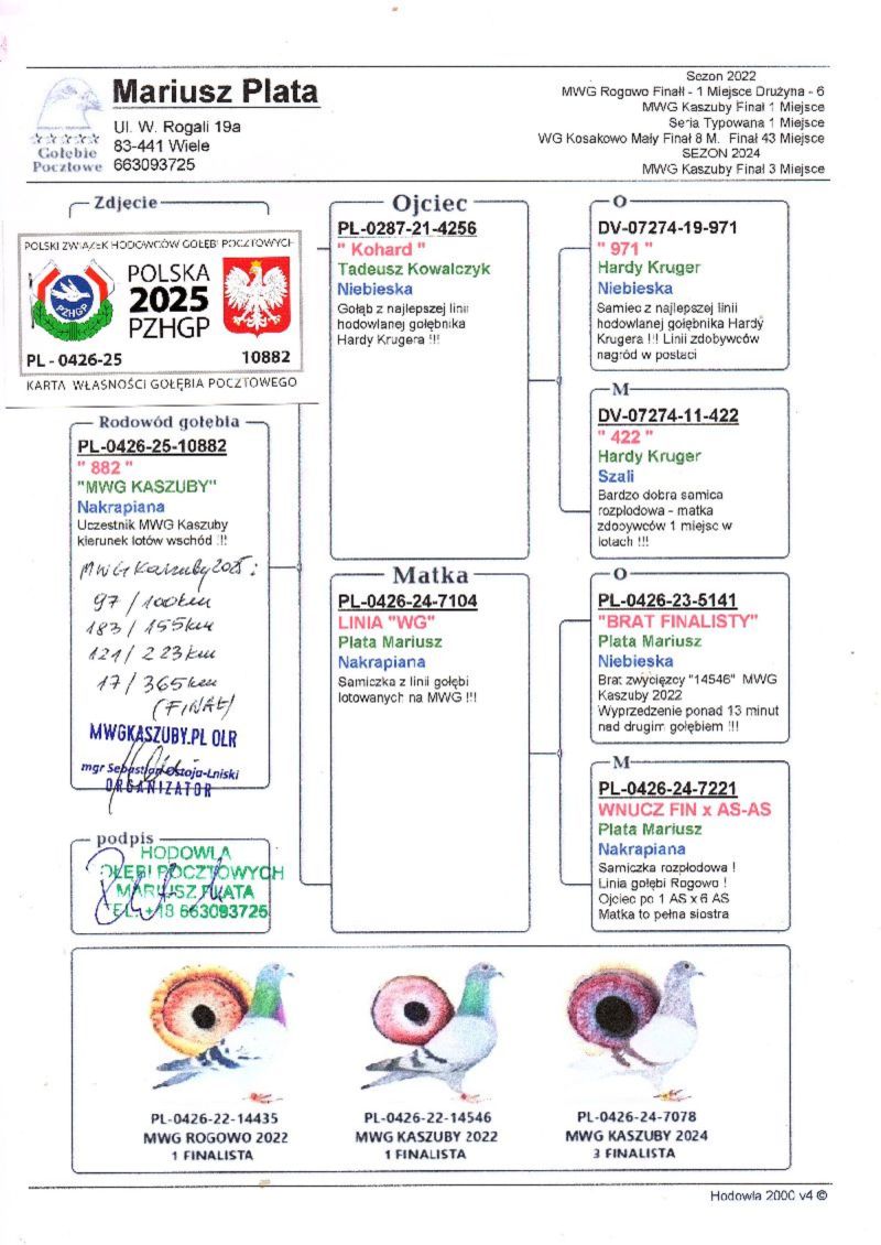 Gołąb (17 MIEJSCE z lotu Finałowego) brał udział w zawodach na Wspólnym Gołębniku KASZUBY. Więcej informacji w rodowodzie i załącznikach. Kontakt do Właściciela Gołębnika tel.601686344 (Sebastian Ostoja-Lniski). Informujemy poza tym, że rozpoczęły się zapisy na sezon 2026. Serdecznie zapraszam do rywalizacji.