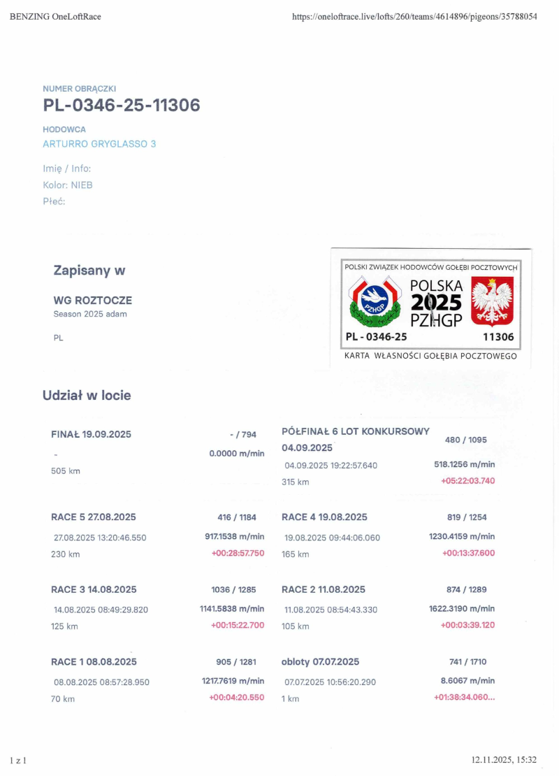 Gołąbek po całym bardzo wymagającym programie na WG ROZTOCZE 2025 loty z wiatrem pod wiatr i boczny w każdych warunkach sobie poradziły. 7 Lotów Konkursowych 1515 kkm zdobywając dolot miejsce z Finału 505kM więcej info.w rodowodzie i na stronie Benzing Live. oneloftrace.live/lofts/260?season=2458&tab=flights zapraszamy na sezon 2026. Dostawa wylicytowanego gołębia na terenie Polski 160zł.