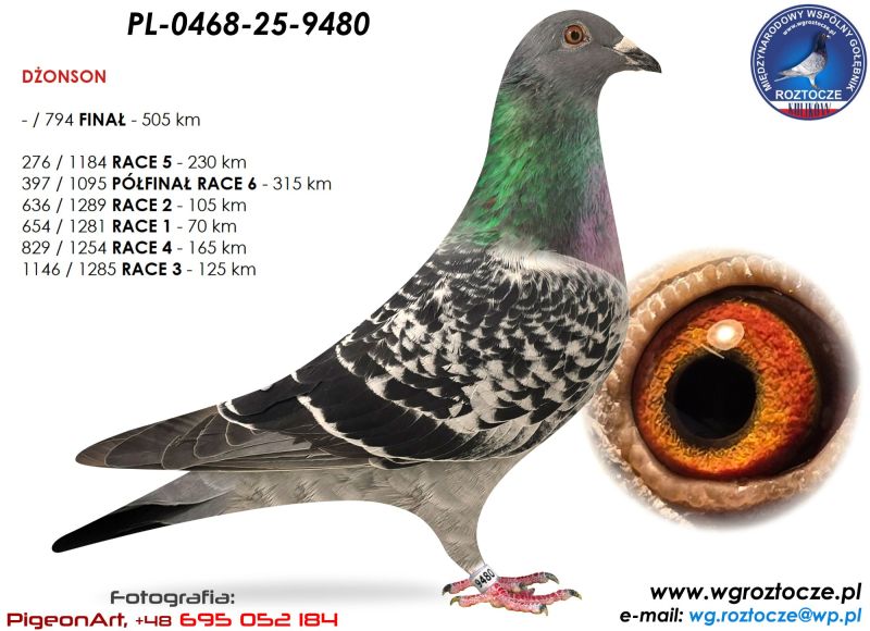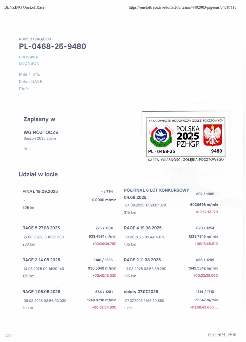 Opis: Gołąbek po całym bardzo wymagającym programie na WG ROZTOCZE 2025 loty z wiatrem pod wiatr i boczny w każdych warunkach sobie poradziły. 8 Lotów Konkursowych 2015 kkm zdobywając dolot miejsce z Finału 505km. więcej info.w rodowodzie i na stronie Benzing Live. oneloftrace.live/lofts/260?season=2458&tab=flights zapraszamy na sezon 2026. Dostawa wylicytowanego gołębia na terenie Polski 160zł.
