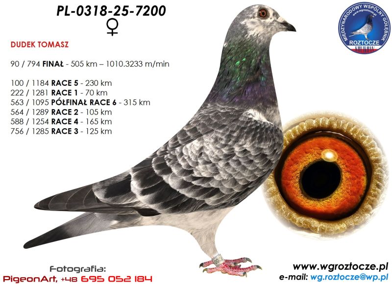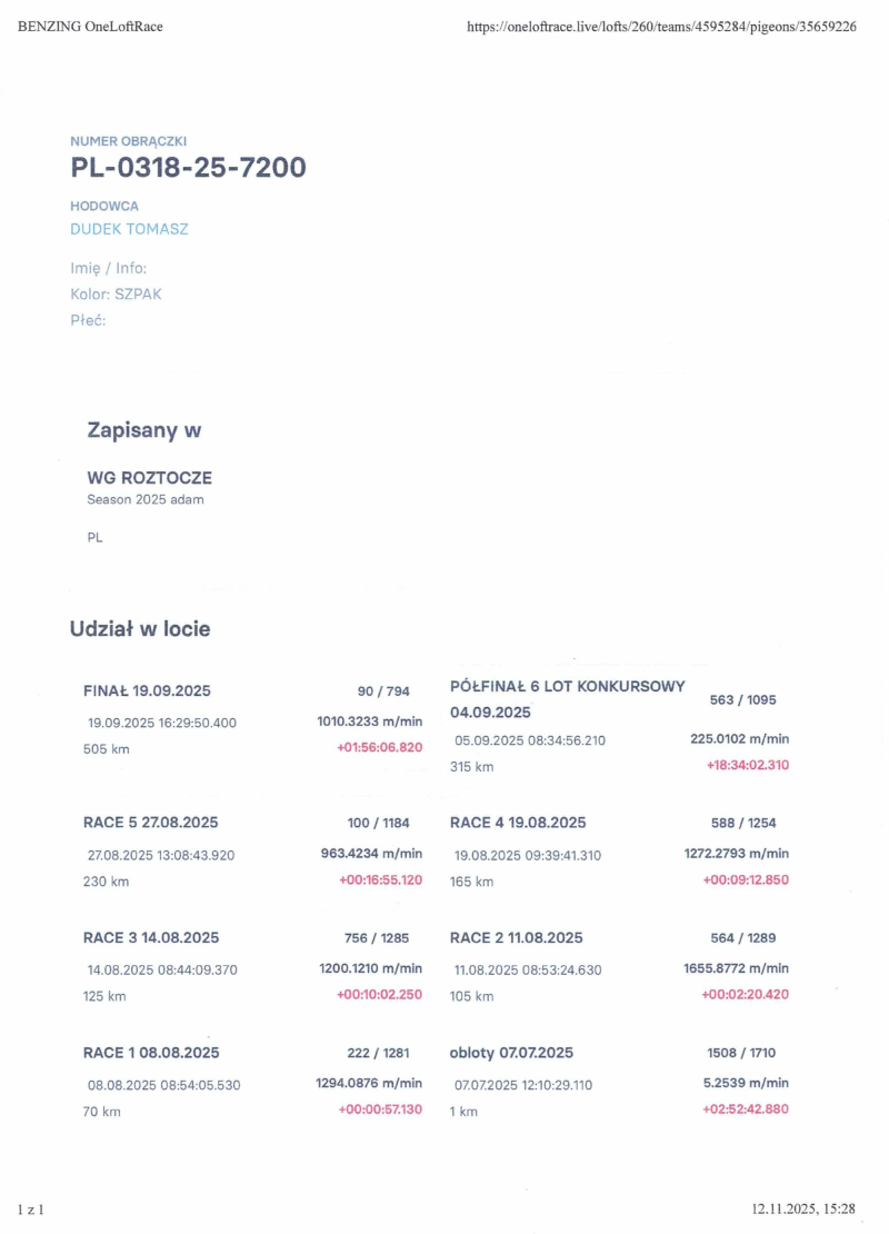 Opis: Gołąbek po całym bardzo wymagającym programie na WG ROZTOCZE 2025 loty z wiatrem pod wiatr i boczny w każdych warunkach sobie poradziły. 7 Lotów Konkursowych 1515 kkm zdobywając 90 miejsce z Finału 505km. więcej info.w rodowodzie i na stronie Benzing Live. oneloftrace.live/lofts/260?season=2458&tab=flights zapraszamy na sezon 2026. Dostawa wylicytowanego gołębia na terenie Polski 160zł.