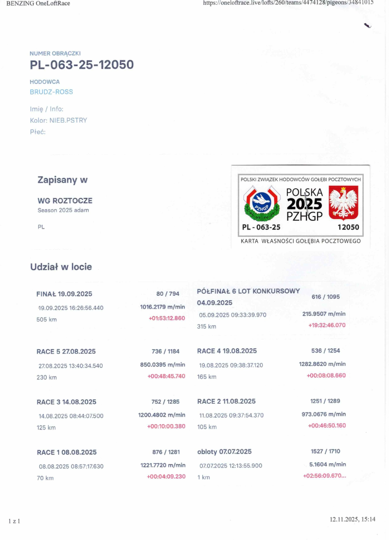 Opis: Gołąbek po całym bardzo wymagającym programie na WG ROZTOCZE 2025 loty z wiatrem pod wiatr i boczny w każdych warunkach sobie poradziły. 7 Lotów Konkursowych 1515 kkm zdobywając 80 miejsce z Finału 505km. więcej info.w rodowodzie i na stronie Benzing Live. oneloftrace.live/lofts/260?season=2458&tab=flights zapraszamy na sezon 2026. Dostawa wylicytowanego gołębia na terenie Polski 160zł.