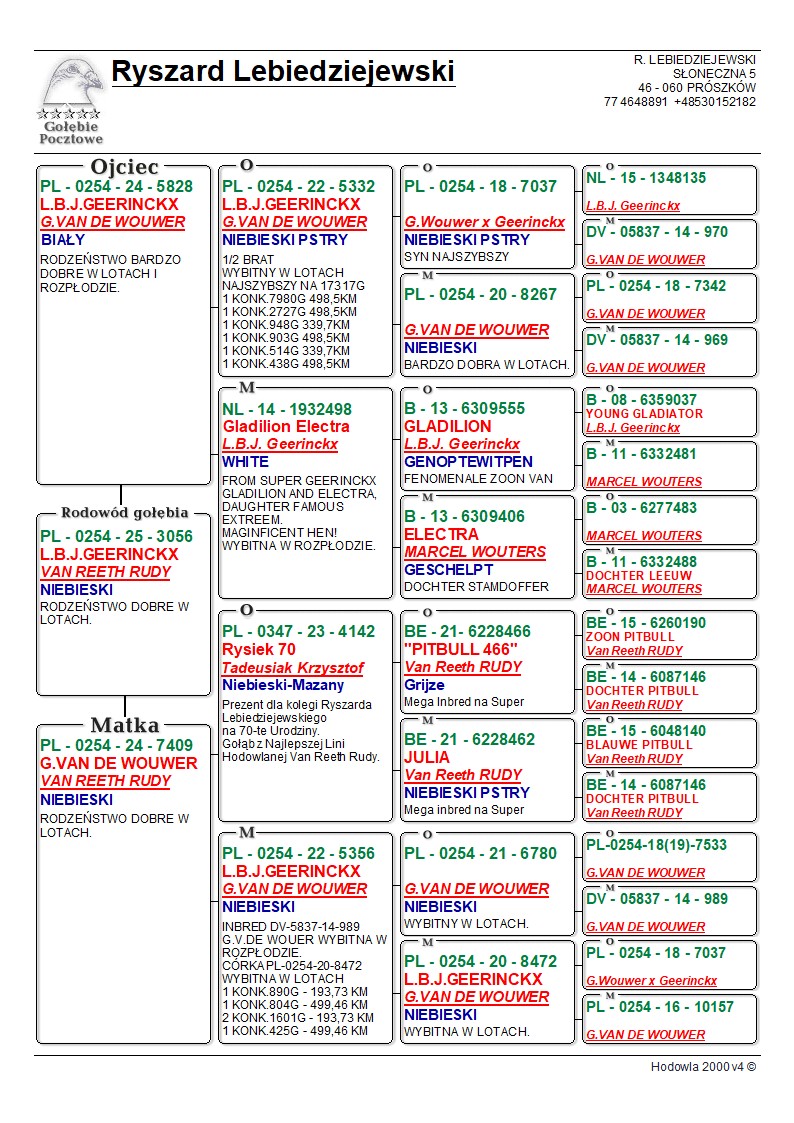*prawdopodobnie samica* Oryginalny gołąb z hodowli Ryszard Lebiedziejewskiego. Szczegóły pochodzenia w rodowodzie. Więcej informacji pod nr tel.: 530 152 182. **Gołębie po kuracjach przygotowane do sezonu. **Transport gołębi prywatnym kurierem 100 zł do 3 szt. od 4szt do 6szt 150zł.