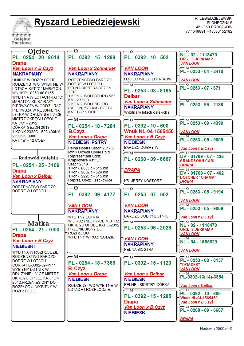 *prawdopodobnie samiec* Oryginalny gołąb z hodowli Ryszard Lebiedziejewskiego. Szczegóły pochodzenia w rodowodzie. Więcej informacji pod nr tel.: 530 152 182. **Gołębie po kuracjach przygotowane do sezonu. **Transport gołębi prywatnym kurierem 100 zł do 3 szt. od 4szt do 6szt 150zł.