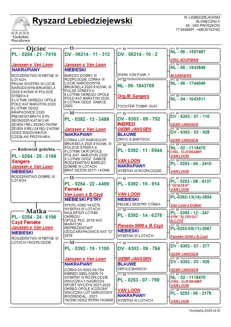 *prawdopodobnie samica* Oryginalny gołąb z hodowli Ryszard Lebiedziejewskiego. Szczegóły pochodzenia w rodowodzie. Więcej informacji pod nr tel.: 530 152 182. **Gołębie po kuracjach przygotowane do sezonu. **Transport gołębi prywatnym kurierem 100 zł do 3 szt. od 4szt do 6szt 150zł.