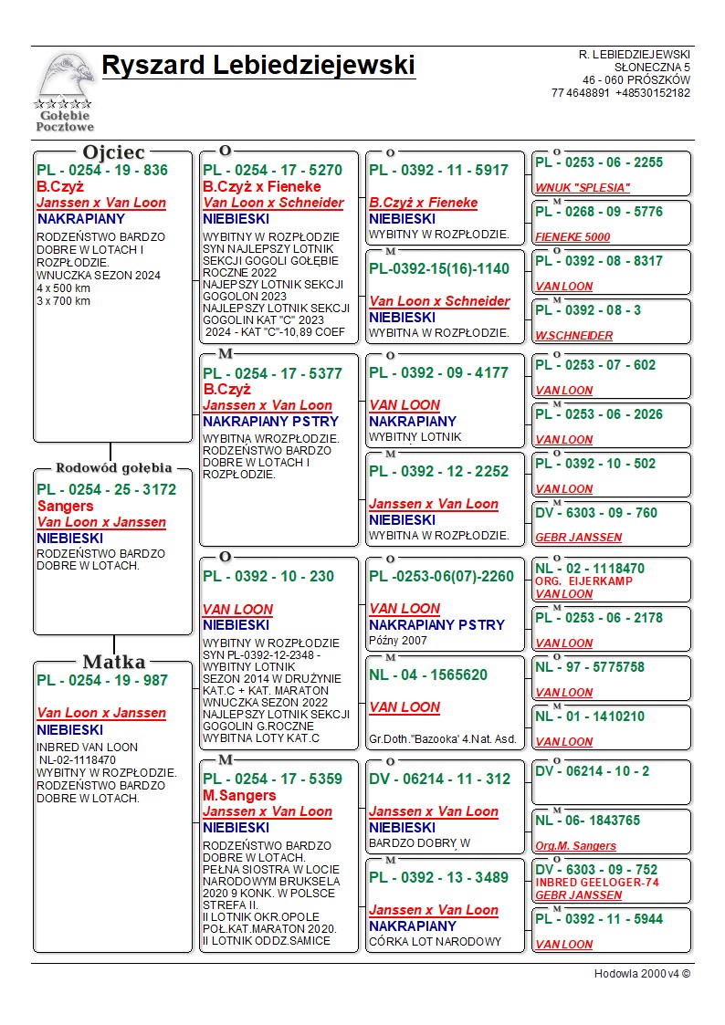 *prawdopodobnie samica* Oryginalny gołąb z hodowli Ryszard Lebiedziejewskiego. Szczegóły pochodzenia w rodowodzie. Więcej informacji pod nr tel.: 530 152 182. **Gołębie po kuracjach przygotowane do sezonu. **Transport gołębi prywatnym kurierem 100 zł do 3 szt. od 4szt do 6szt 150zł.