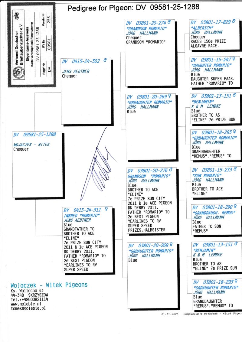 Oryginalny gołąb z hodowli Wojaczek - Witek. Płeć gołębia to prawdopodobnie samiczka. Ojciec i matka prezentowanego gołębia są prawnukami "Romario" J. Hallmanna. Szczegóły pochodzenia w rodowodzie. Więcej informacji pod nr tel.: +48 600 821 114. KOSZT TRANSPORTU 100 ZŁ (maksymalnie 3 gołębie w jednej paczce). KOSZTA TRANSPORTU KLIENCI BĘDĄ PŁACIĆ BEZPOŚREDNIO KIEROWCY KTÓRY PRZYWIEZIE GOŁĘBIE. TRANSPORT ODBĘDZIE SIĘ MIĘDZY 20.11.2025 a 12.12.2025
