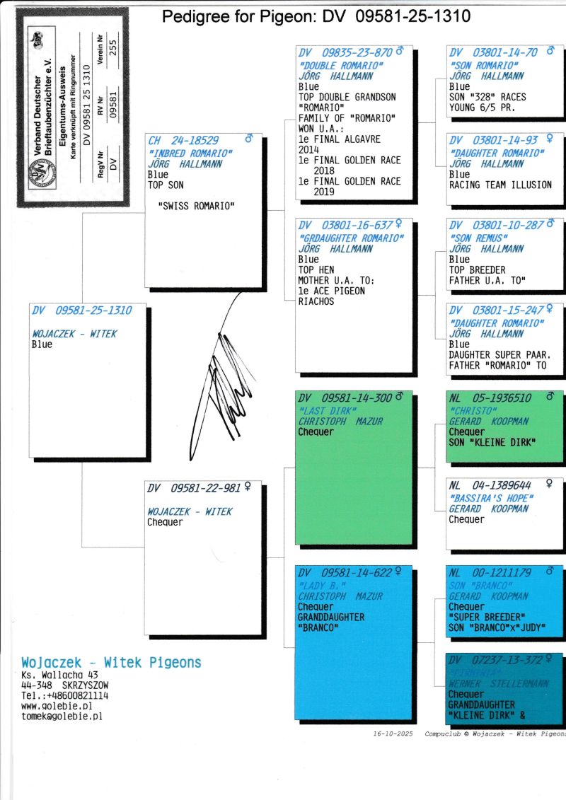 Oryginalny gołąb z hodowli Wojaczek - Witek. Ojciec prezentowanego gołębia jest prawnukiem "Romario" J. Hallmanna matka to prawnuczka "Kleine Dirk" Gerarda Koopmana od Christopha Mazura. Szczegóły pochodzenia w rodowodzie. Więcej informacji pod nr tel.: +48 600 821 114. KOSZT TRANSPORTU 100 ZŁ (maksymalnie 3 gołębie w jednej paczce). KOSZTA TRANSPORTU KLIENCI BĘDĄ PŁACIĆ BEZPOŚREDNIO KIEROWCY KTÓRY PRZYWIEZIE GOŁĘBIE. TRANSPORT ODBĘDZIE SIĘ MIĘDZY 20.11.2025 a 12.12.2025