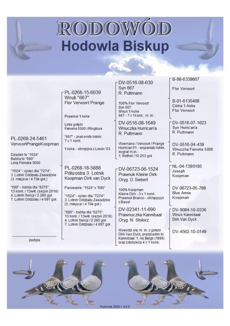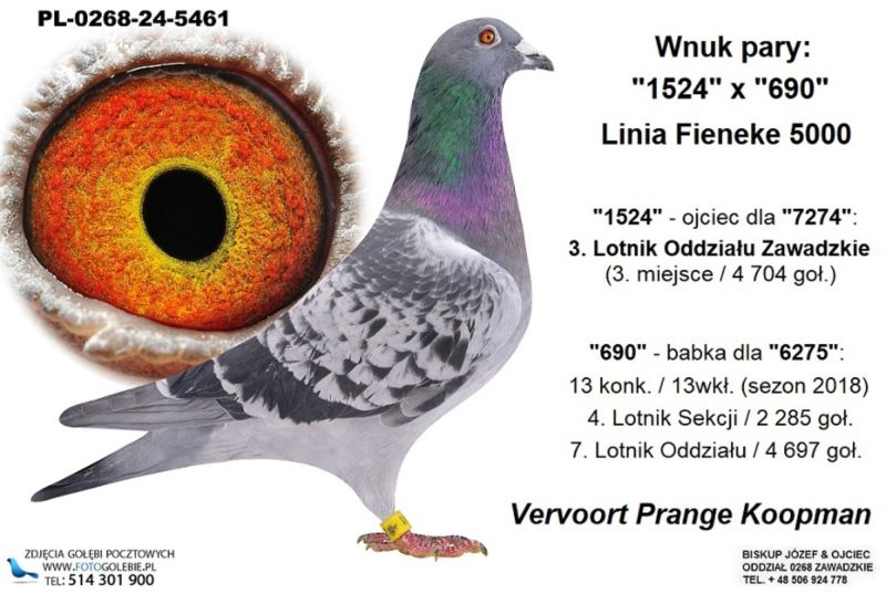 Dziadek to "1524"; Babka to "690"; Linia Fieneke 5000; "1524" - ojciec dla "7274": 3.Lotnik Oddziału Zawadzkie (3. miejsce / 4 704 goł.); "690" - babka dla "6275": 13 konk. / 13wkł. (sezon 2018), 4.Lotnik Sekcji / 2 285 goł., 7.Lotnik Oddziału / 4 697 goł.; Koszt wysyłki 150 zł