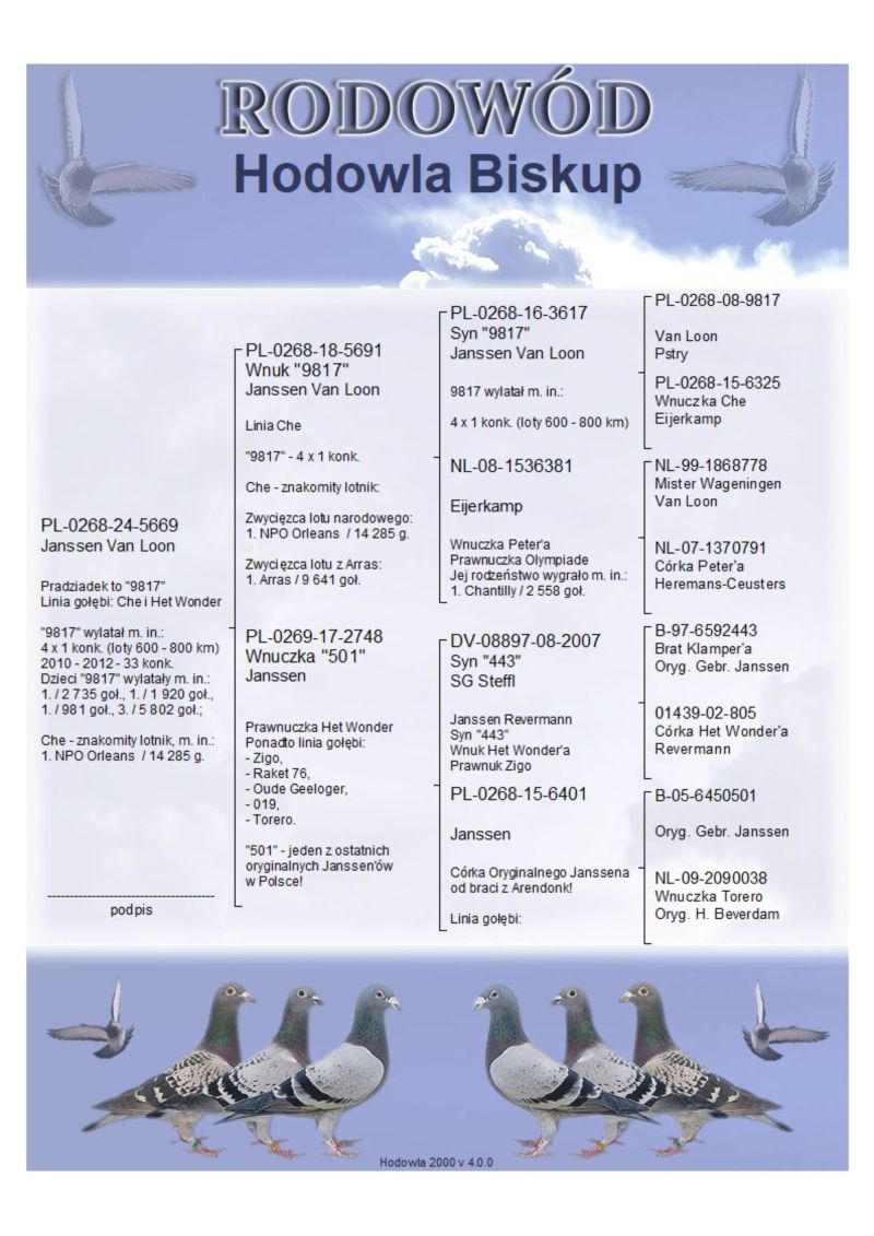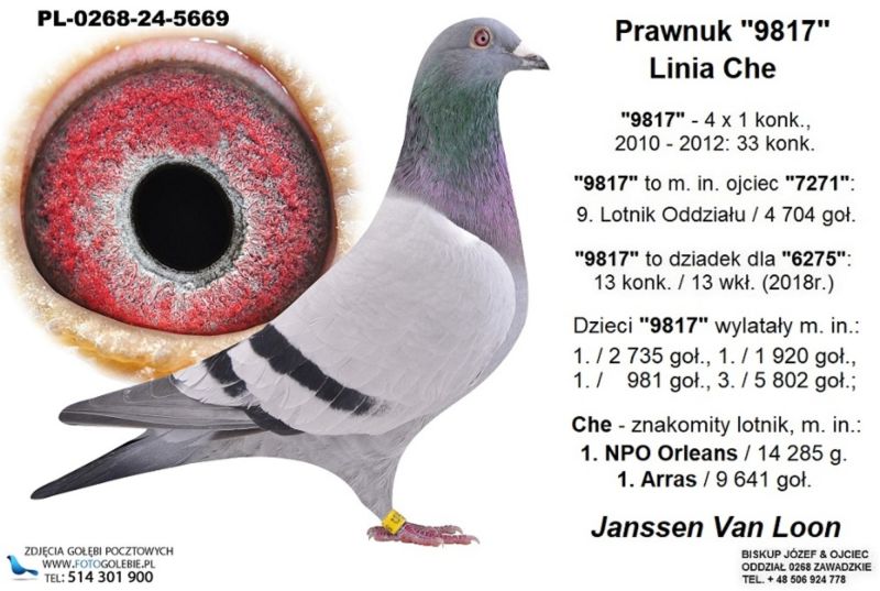 Pradziadek to "9817"; Linia gołębi: Che i Het Wonder; "9817" wylatał m. in.: 4 x 1 konk. (loty 600 - 800 km), 2010 - 2012 - 33 konk., Dzieci "9817" wylatały m. in.: 1. / 2 735 goł., 1. / 1 920 goł., 1. / 981 goł., 3. / 5 802 goł.; Che - znakomity lotnik, m. in.: 1. NPO Orleans / 14 285 g.; Koszt wysyłki 150 zł