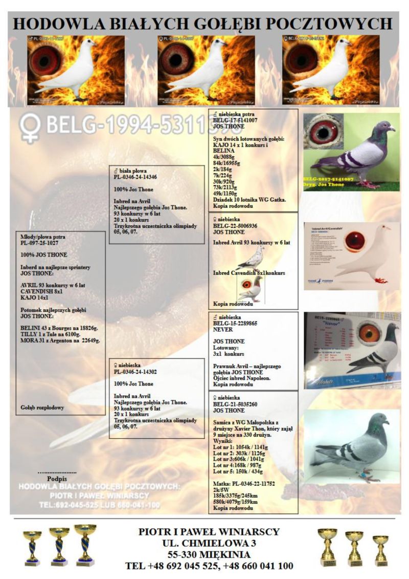 Kup teraz 260. Dzień dobry koleżanki i koledzy.Prezentuje młode gołębie 100% Jos Thoné. Zachęcam do odwiedzenia strony Josa - thone.be/en/ .Golebie świetnie nadają się do krzyżowania. W 2024 młody 50% Jos Thoné został 10 lotnikiem na WG. Kolejny młody zdobył 5/6 konkursów w tym zlotu dodatkowego był 7 na rejon. Gołębie są sprzedawane z powodu rezygnacji z lotowania gołębiami w PZHGP. Pełne pochodzenie i karta do kazdego gołębia. Zachęcam do zadawania pytań. Jestem dostępny dla Państwa pod numerem telefonu 692045525. Do usłyszenia i zobaczenia. Do Myszkowa i Grudziądza wysyłka gratis. Proszę o kontakt przed zalicytowaniem w celu ustalenia płci i warunków transport