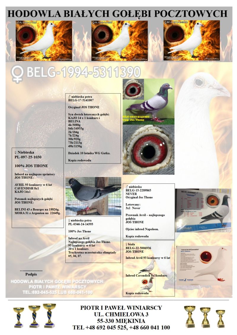Opis: Kup teraz 300. Dzień dobry koleżanki i koledzy.Prezentuje młode gołębie 100% i 50% Jos Thoné. Zachęcam do odwiedzenia strony Josa - thone.be/en/ .Golebie świetnie nadają się do krzyżowania. W 2024 młody 50% Jos Thoné został 10 lotnikiem na WG. Kolejny młody zdobył 5/6 konkursów w tym zlotu dodatkowego był 7 na rejon. Gołębie są sprzedawane z powodu rezygnacji z lotowania gołębiami w PZHGP. Pełne pochodzenie i karta do kazdego gołębia. Zachęcam do zadawania pytań. Jestem dostępny dla Państwa pod numerem telefonu 692045525. Do usłyszenia i zobaczenia. Do Myszkowa i Grudziądza wysyłka gratis. Proszę o kontakt przed zalicytowaniem w celu ustalenia płci i warunków transport
