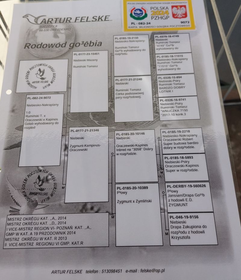 Oryginalny gołąb z hodowli Artura Felske. Aukcja grzecznościowa starszego śląskiego hodowcy z długoletnim stażem hodowlanym z uwagi na likwidację gołębnika rozpłodowego. Szczegóły pochodzenia w rodowodzie. Więcej informacji pod nr tel.: 500678774, 602695372. Możliwy odbiór osobisty lub wysyłka 150 zł do 6 szt.