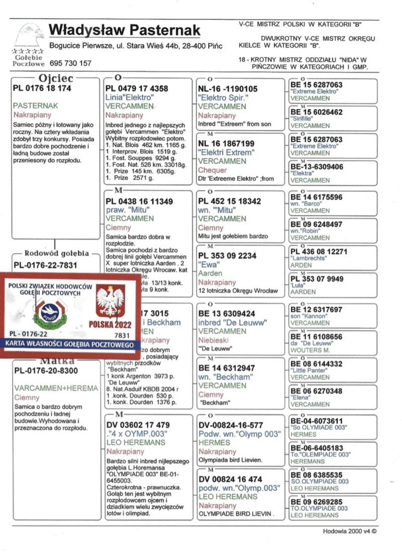 Oryginalny gołąb z hodowli Władysława Pasternaka. Szczegóły pochodzenia w rodowodzie. Więcej informacji pod nr tel.: 728 218 882 *Możliwość wysyłki